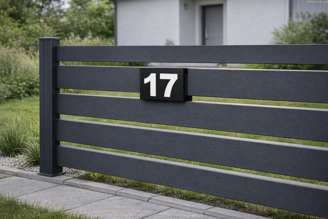 Estetyczna i solidna plakietka z numerem domu / posesji, zaprojektowana specjalnie do aluminiowych przęseł ogrodzeniowych z profili prostokątnych. Montowana na klik, bez konieczności wiercenia otworów w profilu.