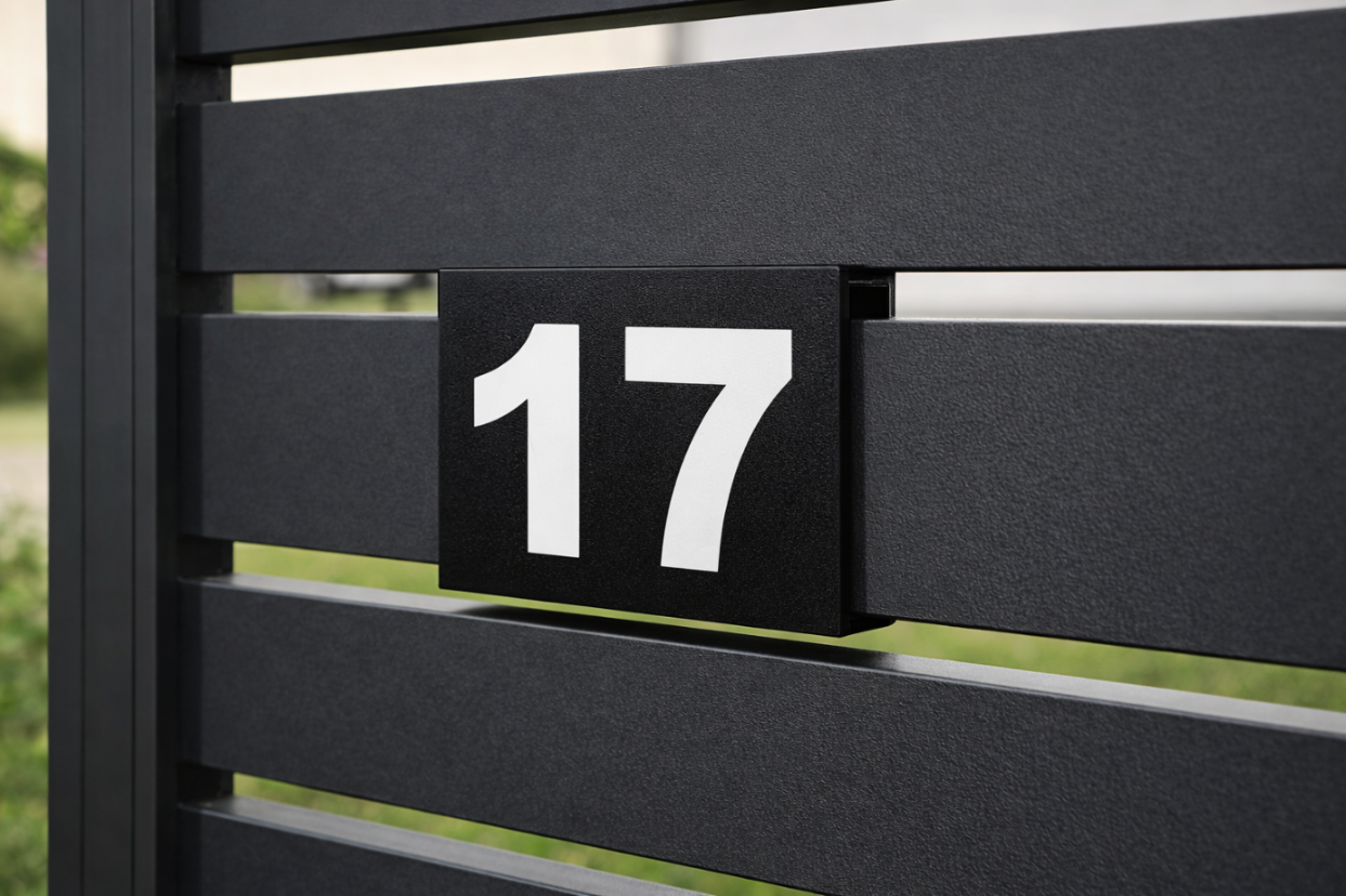 Estetyczna i solidna plakietka z numerem domu / posesji, zaprojektowana specjalnie do aluminiowych przęseł ogrodzeniowych z profili prostokątnych. Montowana na klik, bez konieczności wiercenia otworów w profilu.