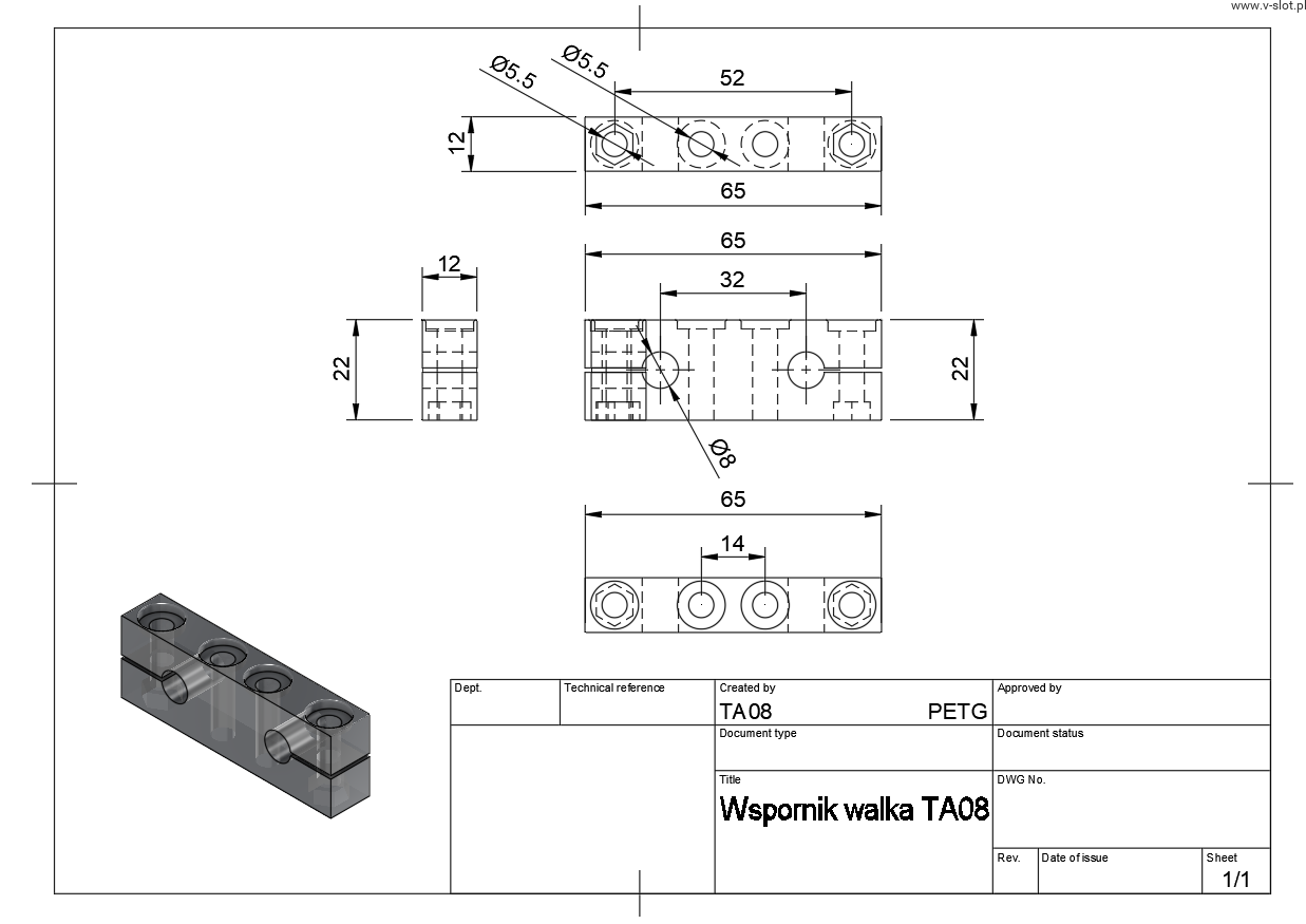 - 1x Podpora wałka TA08 (wydrukowana w technologii FDM z PET-G)