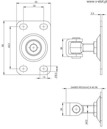 Zawias regulowany do przykręcenia M12 z szyldem 85x54 mm z otworami w kształcie fasoli