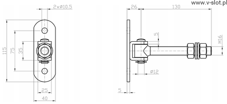 Zawias regulowany do przykręcenia M16 L-130 z szyldem 115x40x5 mm