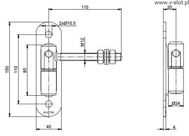 Zawias regulowany toczony Fi24 z kulką M12 z szyldem 150x40x4 mm