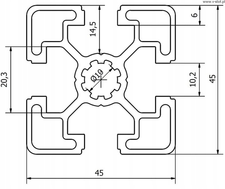Oferowany przez nas profil aluminiowy konstrukcyjny w rozmiarze 45x45 jest produkowany przez firmę V-SLOT. Profil wykonany z aluminium 6063 anodowany w kolorze czarnym. Aluminiowy profil konstrukcyjny zalicza się do profili wchodzących w skład profili konstrukcyjnych z klasycznym rowkiem T 10. Ten rodzaj jest kompatybilny z większością akcesoriów skierowanych do profili z rowkiem 10.